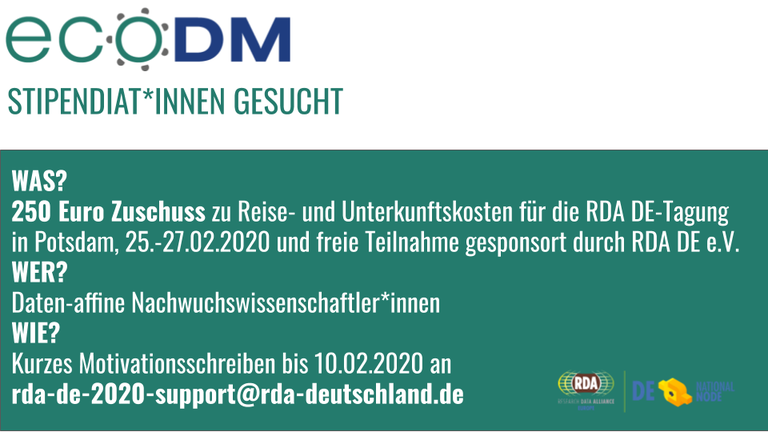 - Das Stipendium umfasst die Teilnahme an der RDA Tagung inklusive aller Workshops sowie einen Zuschuss durch das Projekt EcoDM zu Reise- und Übernachtungskosten bis zu einem Betrag von 250 Euro.